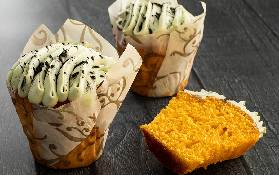 To make Halloween muffins, just use our new white soft filling from R&W Scott (SCM240), coloured with green cocoa butter (SCR471), and dust with black and gold truffle powder(SCC842). Click here for the full recipe.
