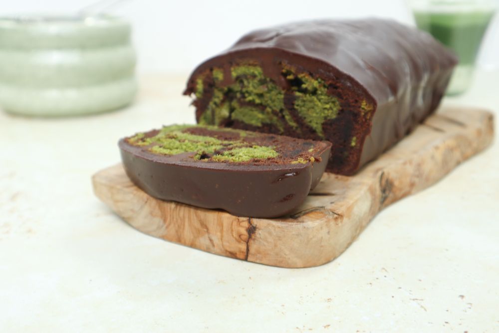 - Spoon alternate dollops of chocolate and matcha batter into the tin, then swirl lightly with a skewer for a marbled effect.