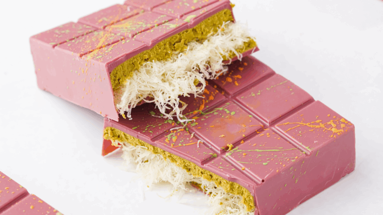 The Angel Hair bar mixes pişmaniye (cotton candy) with pistachio cream, swirled into coloured Belgian white chocolate, plus hints of vanilla, pomegranate, and raspberry—layering texture, visual contrast, and flavour complexity.